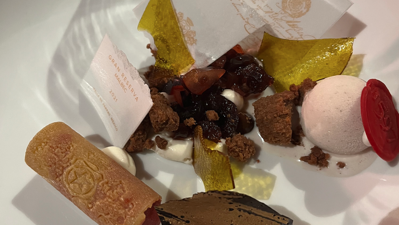 Para el arroz que nos da textura y aromas de fermento un vino escogeremos un vino blanco con buena densidad, la cebolla frita así como el ajonjolí garapiñado me dan aromas y gustos dulces parecidos a la frutas tropicales maduras como algún durazno, plátano o membrillo, para unir estos aromas escogeremos un vino blanco con buena maduración de uva y que tenga barrica. La misma barrica me dará aromas de frutos secos y ayudará a soportar la esponja de mole con sus frutos secos y deshidratados.